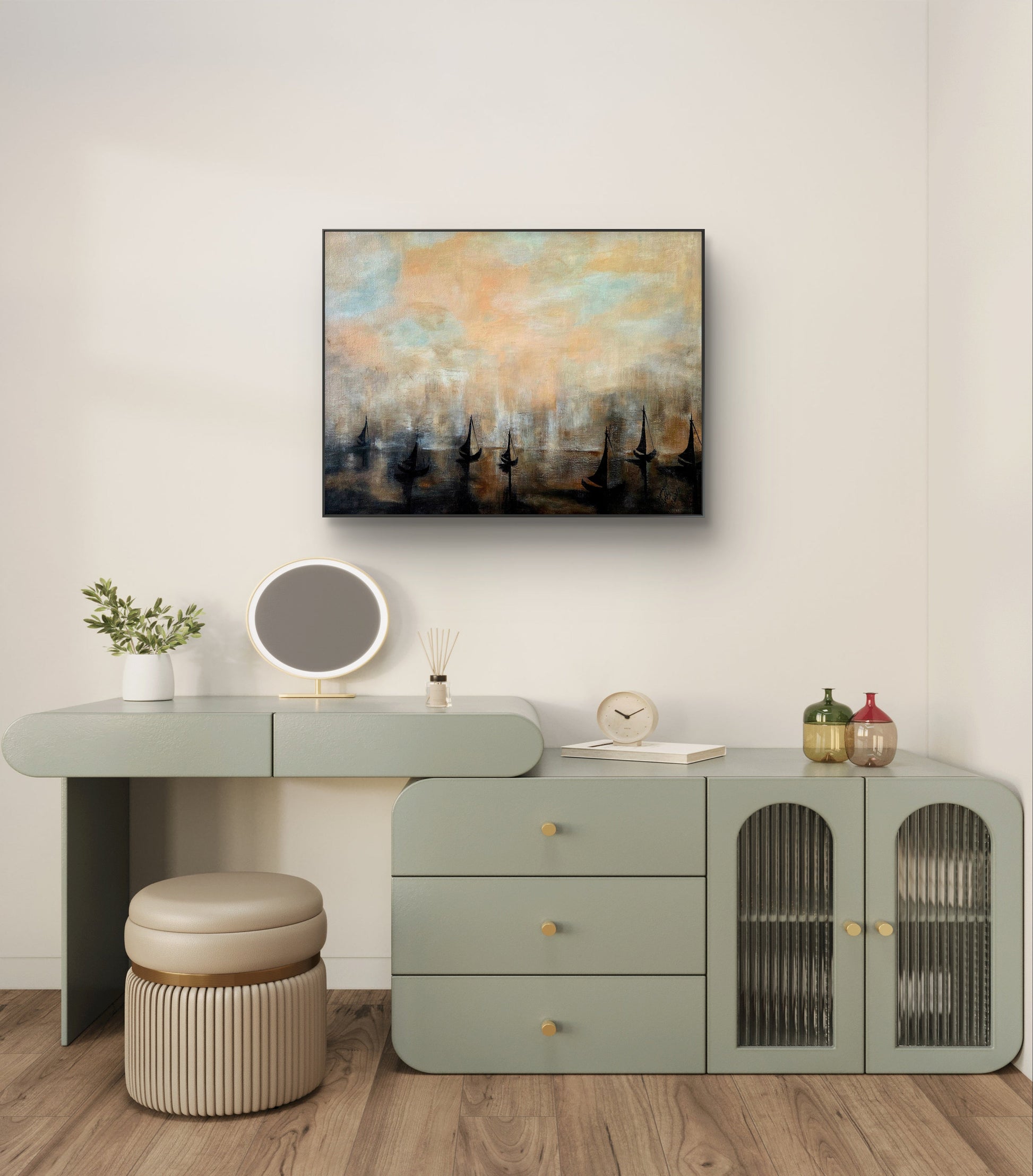 Boats in Mist is an original acrylic painting by contemporary artist Jasmina Mendoza, blending atmosphere and emotion in a serene seascape. Gentle tones of peach, grey, and Arctic blue evoke the calm stillness of boats drifting through a soft morning haze.